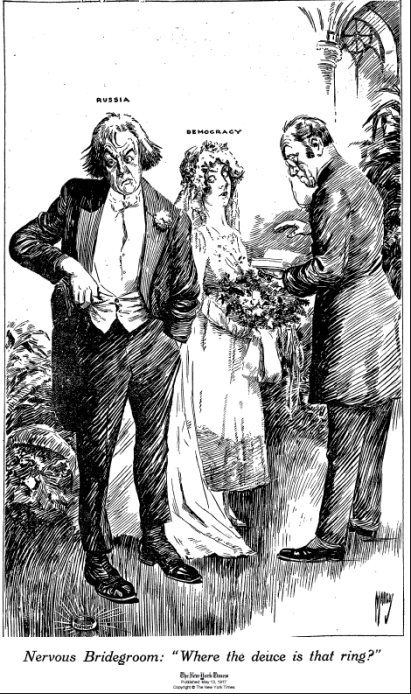 Russia and democracy - nervous bridegroomJesse RifkinMay 11, 2017ShareThis cartoon from NYT Sunday Magazine 100 years ago this week holds up eerily well.From Sunday, May 13, 1917
