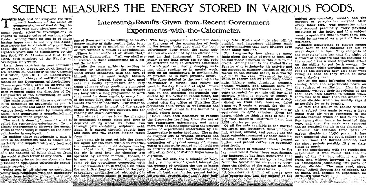 SCIENCE MEASURES THE ENERGY STORED IN VARIOUS FOODS: Interesting Results Given from Recent Government Experiments with the Calorimeter (PDF)