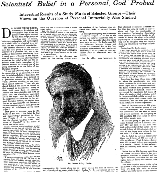 A survey was sent out to 1,000 scientists by a professor of psychology at Bryn Mawr in 1917, asking whether they believed in a personal god. Dividing them into those of "greater" and "lesser" eminence. (The division into "lesser" and "greater" scientists, or really any classification of people in general whether by occupation or other category, would surely not withstand peer-reviewed scrutiny today.)