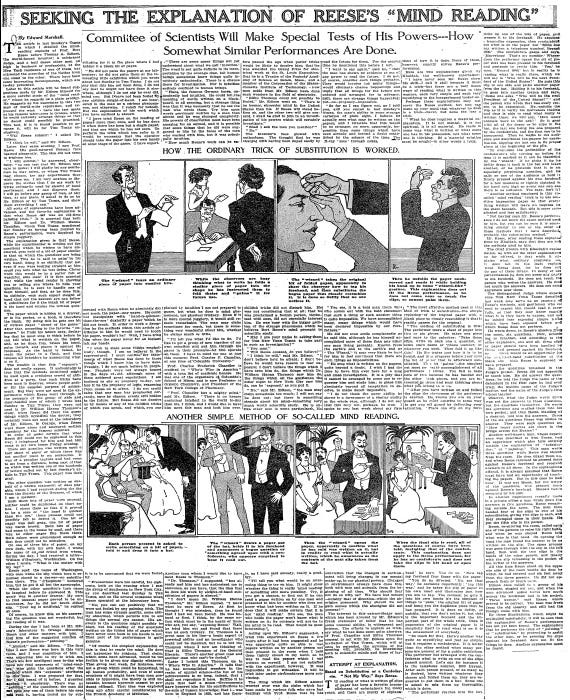 SEEKING THE EXPLANATION OF REESE'S "MIND READING": Committee of Scientists Will Make Special Tests of His Powers -- How Somewhat Similar Performances Are Done. (PDF)