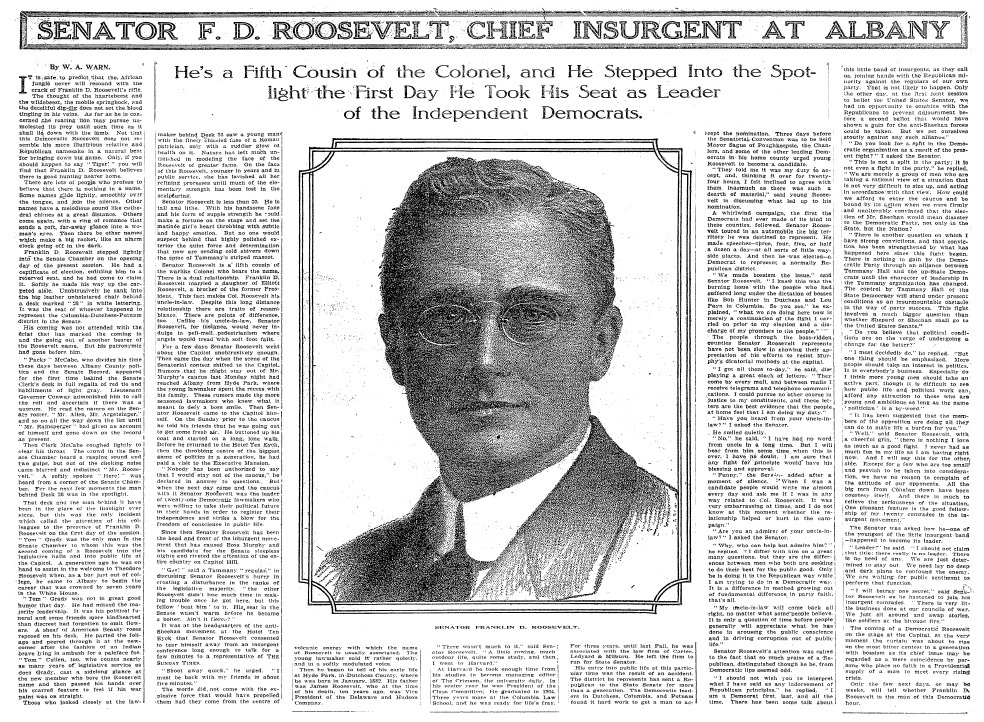 SENATOR F. D. ROOSEVELT, CHIEF INSURGENT AT ALBANY: He's a Fifth Cousin of the Colonel, and He Stepped Into the spotlight the First Day He Took His Seat as Leader of the Independent Democrats. (PDF)