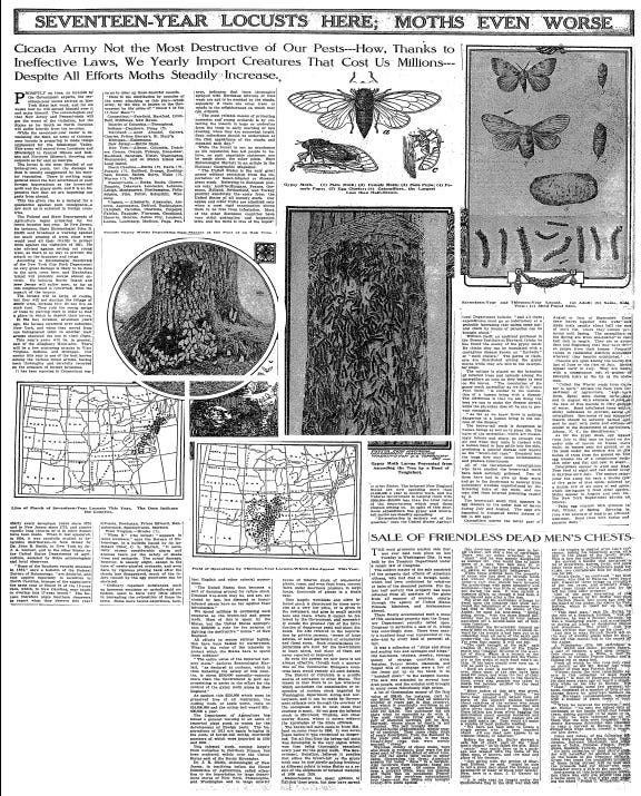 SEVENTEEN-YEAR LOCUSTS HERE; MOTHS EVEN WORSE: Cicada Army Not the Most Destructive of Our Pests -- How, thanks to Ineffective Laws, We Yearly Import Creatures That Cost Us Millions -- Despite All Efforts Moths Steadily Increase. (PDF)
