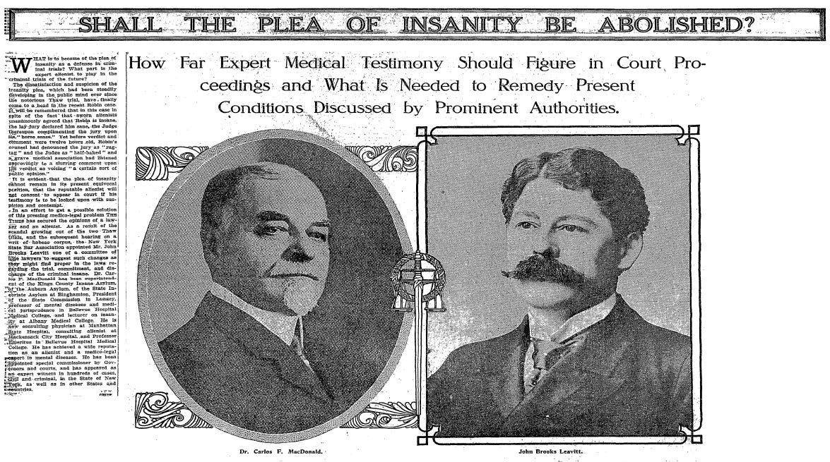 In 1906, architect Stanford White was murdered by Harry Kendall Thaw, who was later found not guilty by reason of insanity. In another more recent case, a jury found a man sane, despite testimony by several psychologists who all agreed that he was insane. These high profile cases lead the Times Magazine to ponder the validity of the insanity plea as it was in 1911.