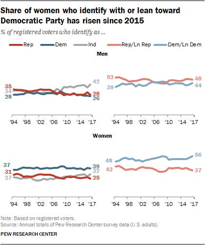 In 1994, female voters leaned more Democratic than Republican by 6 points; by 2017, that was up to 19 points. And female voters voted for Hillary Clinton over Donald Trump by 15 points.