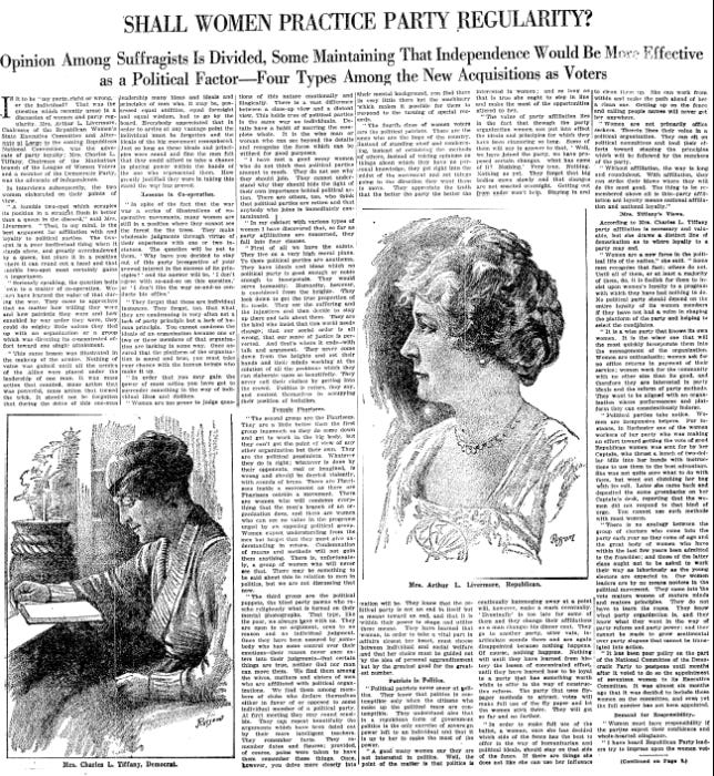 Shall Women Practice Party Regularity?: Opinion Among Suffragists Is Divided, Some Maintaining That Independence Would Be More Effective as a Political Factor -- Four Types Among the New Acquisitions as Voters