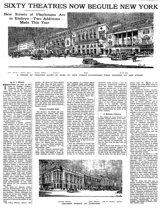 "Of the threescore [60] which now conspire to encumber Broadway... with a seething mob every weeknight, few were in existence even twenty years ago. As a matter of fact, that whole region could muster less than a score [20] of regular playhouses in 1900."