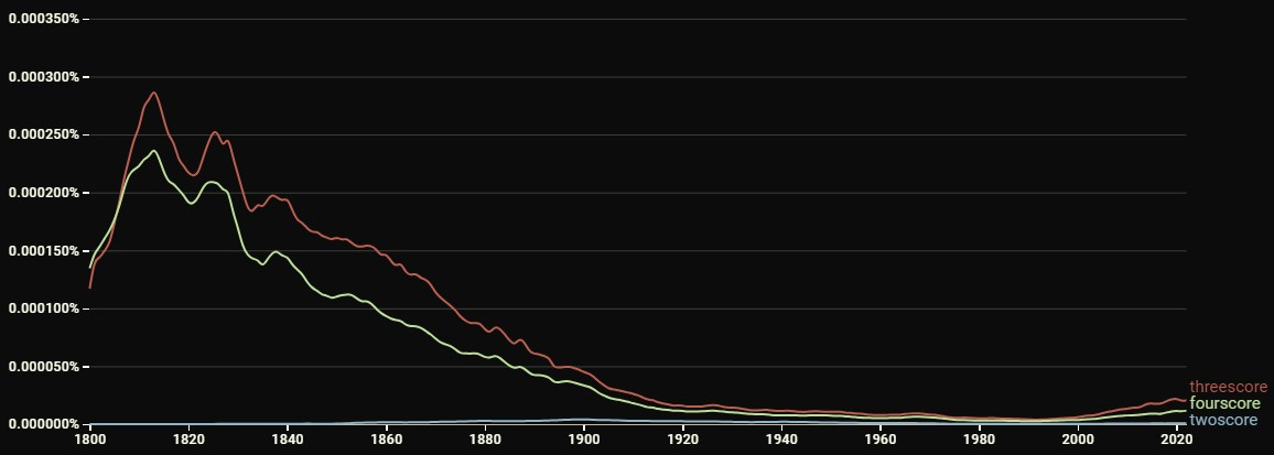 Completely unrelated side note, but clearly people were still occasionally using the word "score" to mean "20" then? As in Lincoln's famous Gettysburg Address opening "Four score and seven years ago." According to Google Books Ngram Viewer, such usage had plummeted to near-zero even by 1924: