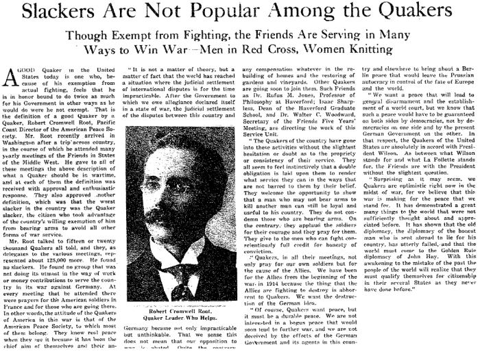 Quakers refused to take up arms in war, as their religious beliefs dictate, but that didn't stop them from participating in every non-combat way they could during World War I. As explained by Robert Cromwell Root, Pacific Coast Director of the American Peace Society and a Quaker himself: