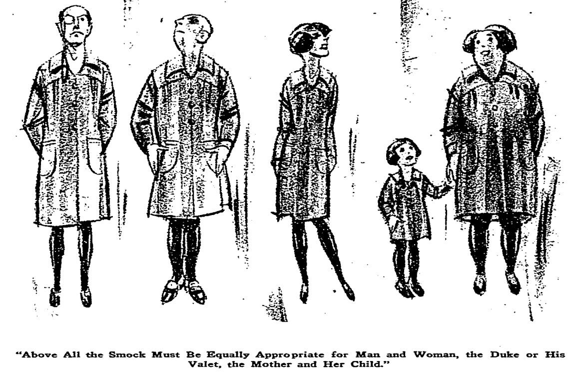 She then goes on to describe what such a “universal uniform” might look like, nicknaming it a “smock,” and the accompanying illustration looked more or less like a trench coat.