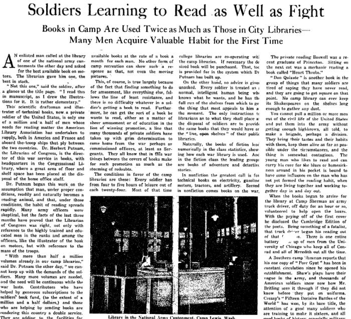 While about 20 percent of the population at the time were enrolled as library borrowers and took out an average of three books per year, World War I soldiers in the camps were enrolled at a rate of 40 percent and took out an average of 12 books per year.