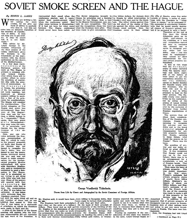 The Russian memorandum of May 11... set forth that Russia of the Soviets was not bound to recognize the Czar's debts, was not bound to pay the money Russia borrowed during the war, and was not bound to make compensation for the foreign-owned property Moscow nationalized. ... Secretary [of State] Hughes said, in declining the invitation to send a delegation to The Hague, that it is absolutely no use trying to get along with folks who talk that way.