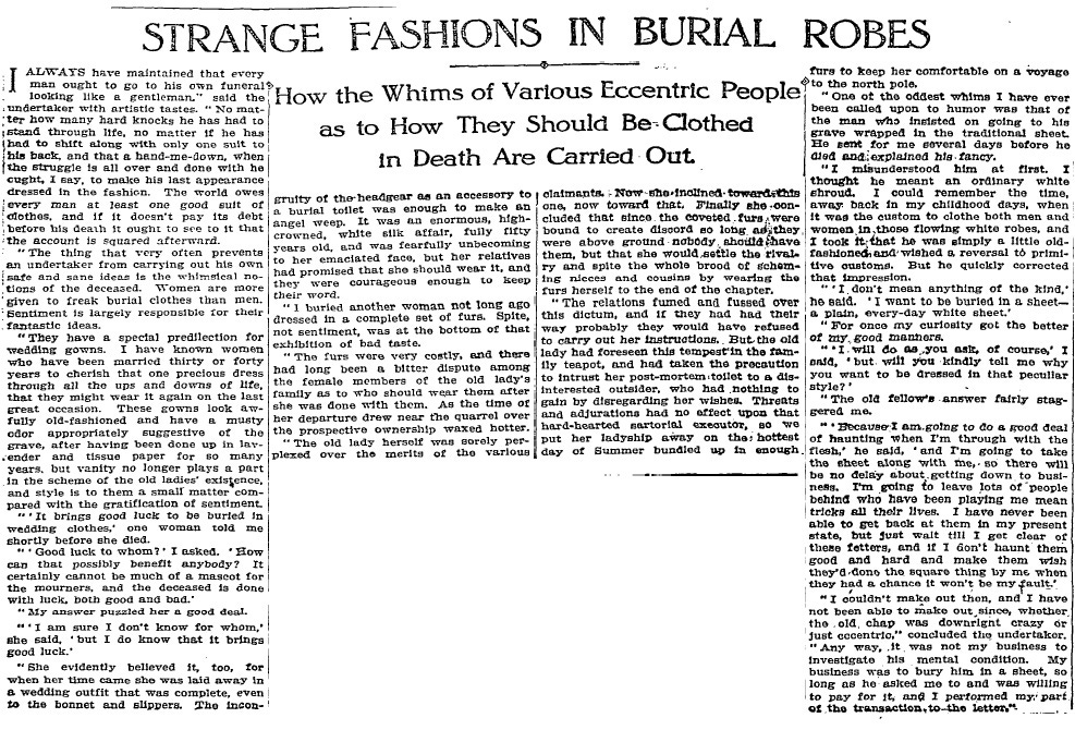 STRANGE FASHIONS IN BURIAL ROBES: How the Whims of Various Eccentric People as to How They Should Be Clothed in Death Are Carried Out (PDF)