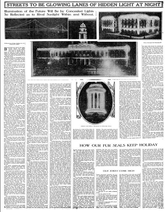 Buildings that glow in the night; façades lighted from hidden sources so that all the architectural detail is brought out as clearly by night as by day; streets in which the atmosphere itself is luminous without any visible means of illumination -- these are among the possibilities of the not distant future.
