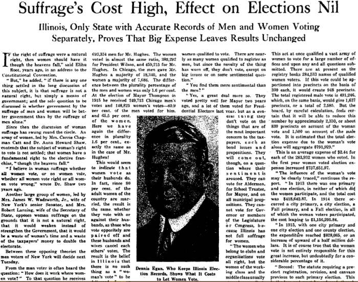 As for increased election costs, it was estimated that New York state would see expenses rise $2.8 million as a result, equivalent to about $52.7 million today. The article ends by referring to how that money could presumably be better spent as World War I raged on: