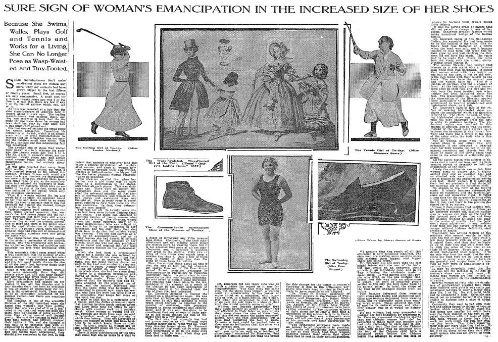 SURE SIGN OF WOMAN'S EMANCIPATION IN THE INCREASED SIZE OF HER SHOES: Because She Swims, Walks, Plays Golf and Tennis and Works for a Living, She Can No Longer Pose as Wasp-Waisted and Tiny-Footed. (PDF)
