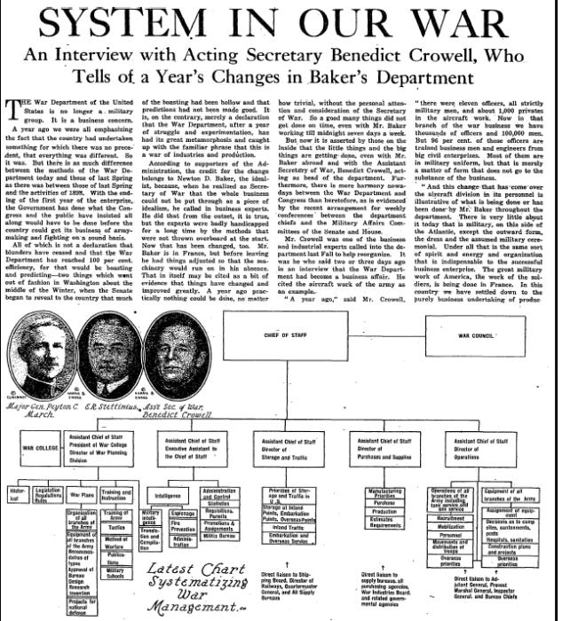 "And this change that has come over the aircraft division in its personnel is illustrative of what is being done or has been done by Mr. Baker [Secretary of War Newton Baker] throughout the department. There is very little about it today that is military, on this side of the Atlantic, except the outward form, the dress and the assumed military ceremonial. Under all that is the same sort of spirit and energy and organization that is indispensable to the successful business enterprise."
