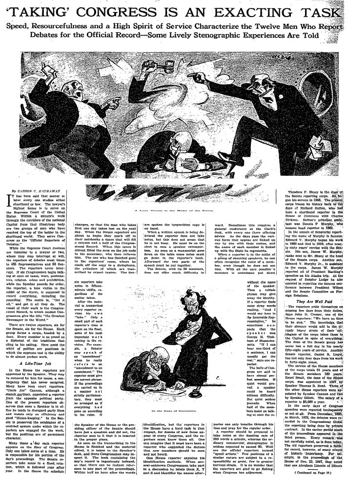 The 1926 NYT Mag article also noted that a congressional stenographer’s salary back then was $6,000 per year. Adjusted for inflation, that would be around $109,000 today.