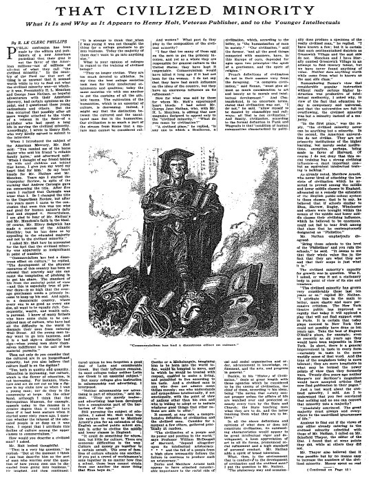In 1924, R. Le Clerc Phillips interviewed Holt for New York Times Magazine, where he again railed against the decline of American culture. This time, though — perhaps sensing his audience — he didn't once cite magazines as a culprit. Instead, he cited several other culprits including money and colleges: