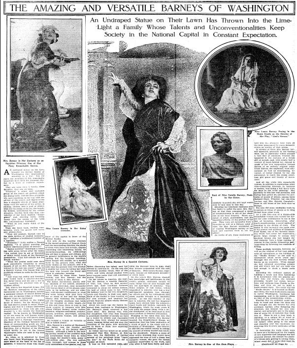One recent day a nude statue appeared on the Barneys' lawn, and word spread that it was a likeness of one of the daughters, sculpted by the other daughter, who was known to be studying sculpture. DC society flocked to the Barney home to see it. On October 14, the Times ran a piece about the statue: