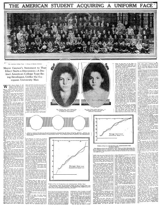 The two faces in the middle of the page are composites of 25 boys and 25 girls, to create the "typical" student face. In modern times, this has been done digitally to interesting effects. I wonder if this is the earliest known example of such a composite.
