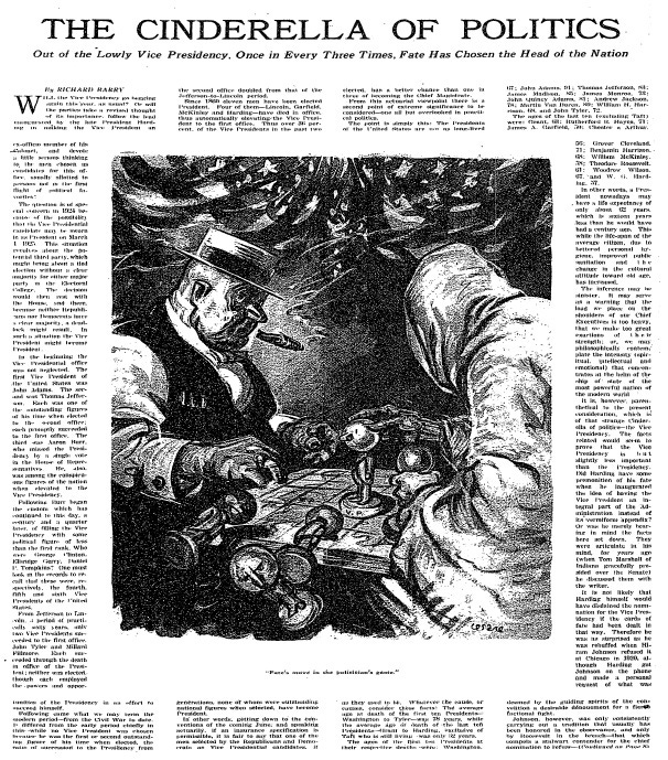 In 1924, the vice presidency was vacant. Former VP Calvin Coolidge had ascended to the presidency, but not yet nominated his own subordinate. New York Times Magazine analyzed who both parties could select as their running mates that summer.
