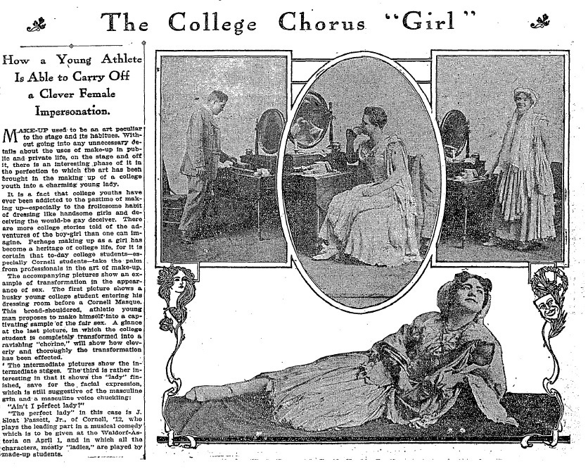 The last paragraph identifies this person as "J. Sloat Fassett, Jr., of Cornell '12, who plays the leading part in a musical comedy which is to begin at the Waldorf-Astoria on April 1, and in which all the character, mostly 'ladies,' are played by made-up students."