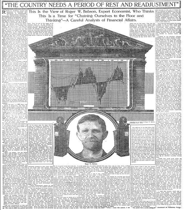 The more I read about economist Roger Babson, the more I realize that he's a hard guy to sum up in a blog entry. He was an economist who believed the business cycle followed the laws of nature. He thought that stocks were like gravity, so what goes up must come down. He didn't just use gravity as a metaphor, but really believed the planet's gravitational pull was a literal influence on business. He eventually founded the Gravity Research Foundation to study gravity (and the possibility of anti-gravity) in 1949.