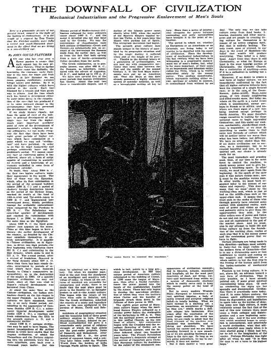 Technology was destroying humankind's spirit and production of true art, poet and future Pulitzer Prize winner John Gould Fletcher wrote in 1924 for New York Times Magazine, but could hopefully be resurrected again "in some future century."