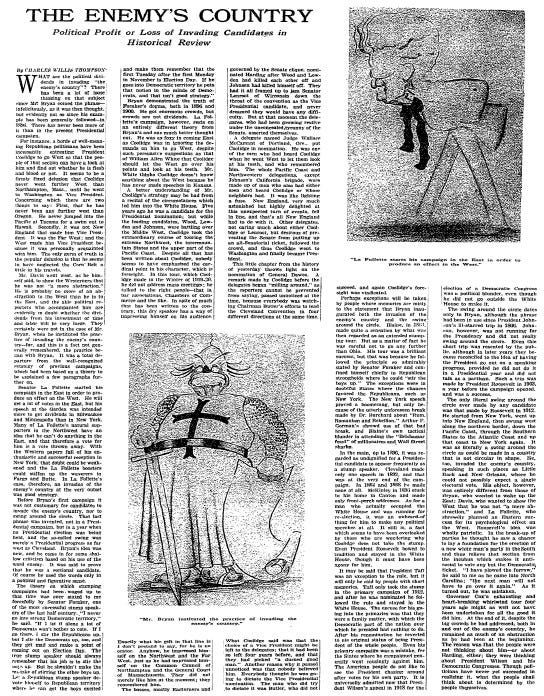 Senator LaFollette started his campaign in the East in order to produce an effect on the West... Many of LaFollette's natural supporters in the Northwest have an idea that he can't do anything in the East, and that therefore a vote for him is a vote thrown away... That doubt could be weakened and the LaFollette boosters could stiffen up the waverers in Fargo and Butte. In LaFollette's case, therefore, an invasion of the enemy's country at the very outset was good strategy.