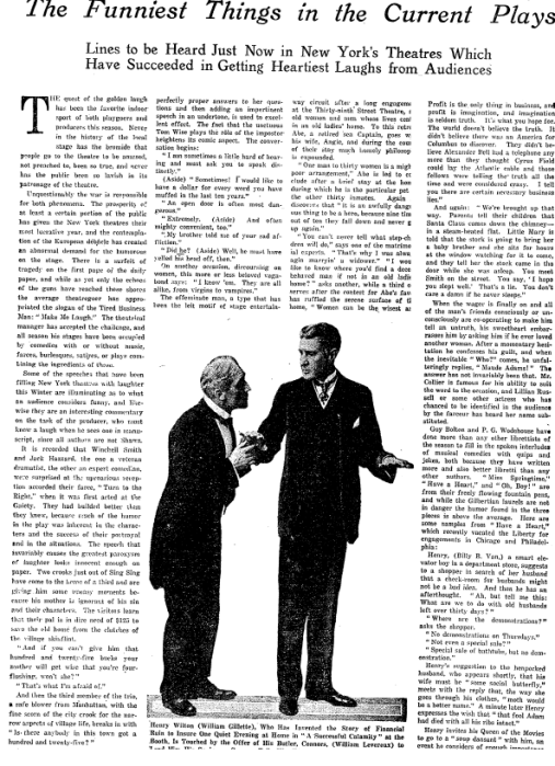 What were the most uproarious lines in theatrical productions from a century ago? Reading most of them mostly confirms my belief that people weren't funny until the late 1970s or early 1980s.