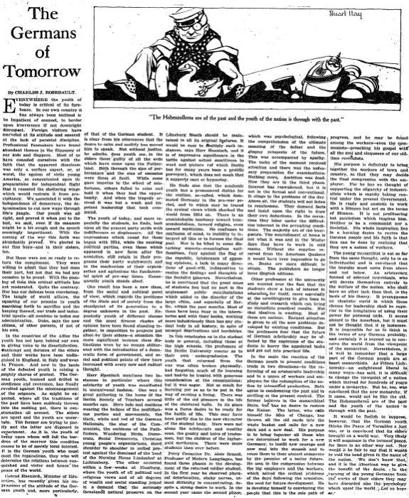 A 1921 article by Charles J. Rosebault predicted German youth would depart from their "obedience and reverence" of the past and could very well pave the pathway to world peace. Hate to break it to you...