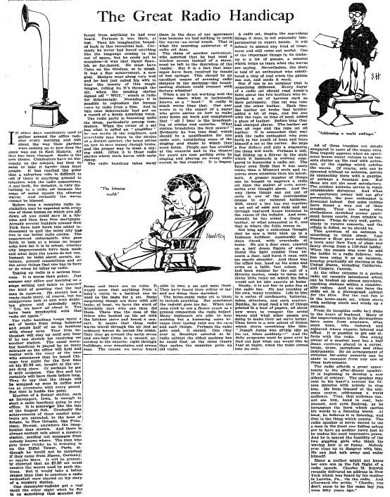 The radio party is becoming quite the thing, particularly among commuters. When the owner of a set has what is called an "amplifier" he can invite in the neighbors, and everybody may listen to the strains of a distant concert, the latest advice on how to save money though broke, and the proper way to treat a crying child. Often is is these radio parties which work havoc with early rising.
