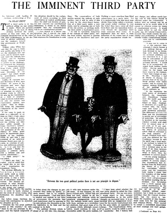Shortly after Election Day 1922, President Woodrow Wilson's former Secretary of War Lindley Miller Garrison advocated the formation of an "anti-radical" third party in a New York Times Magazine column.