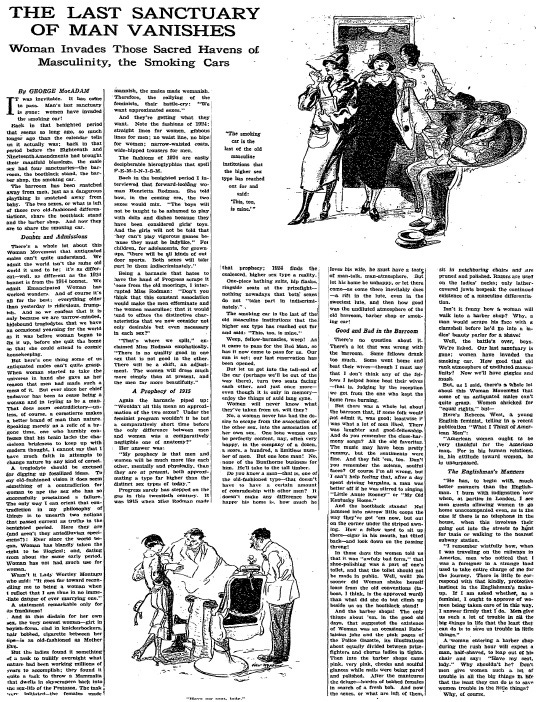 In 1925, women were taking over previously all-male spaces like bars, barbershops, and smoking cars on trains, journalist George MacAdam lamented in New York Times Magazine.
