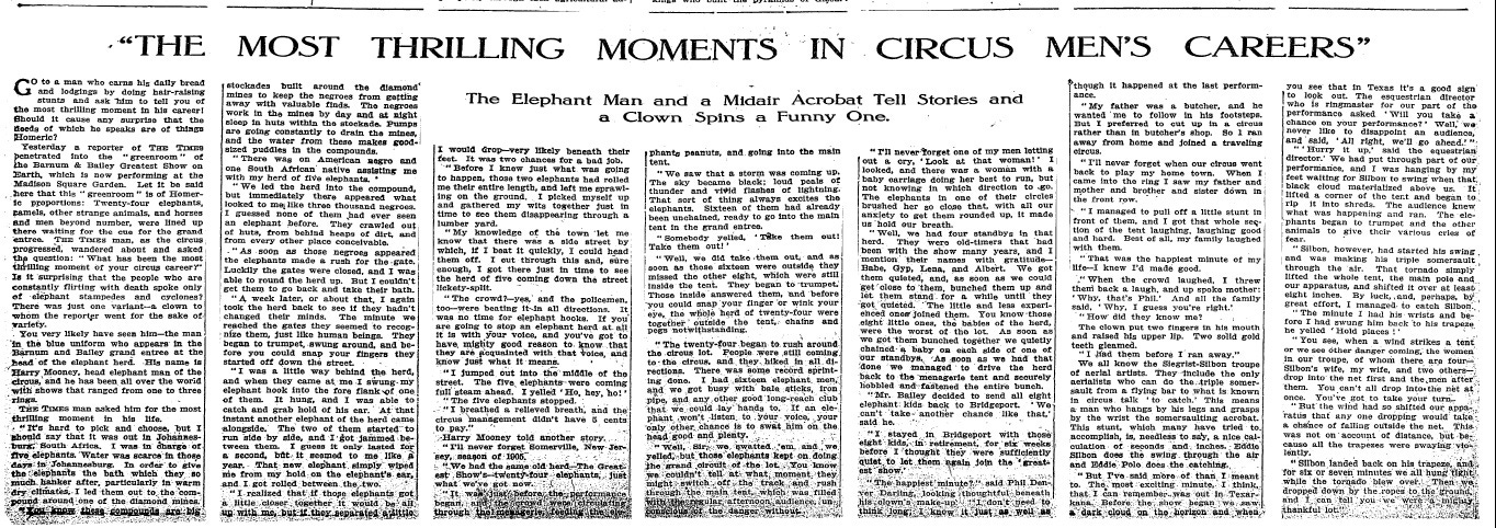The subhead for this article says that the Elephant Man tells a story of one of the most thrilling moments in his career.The Elephant Man I was thinking of had been dead for over 20 years by the time this story was written, so I assumed they weren't talking about him, but I wonder what his answer would have been. Anyway, this elephant man is actually the man at the circus who handles and trains elephants.