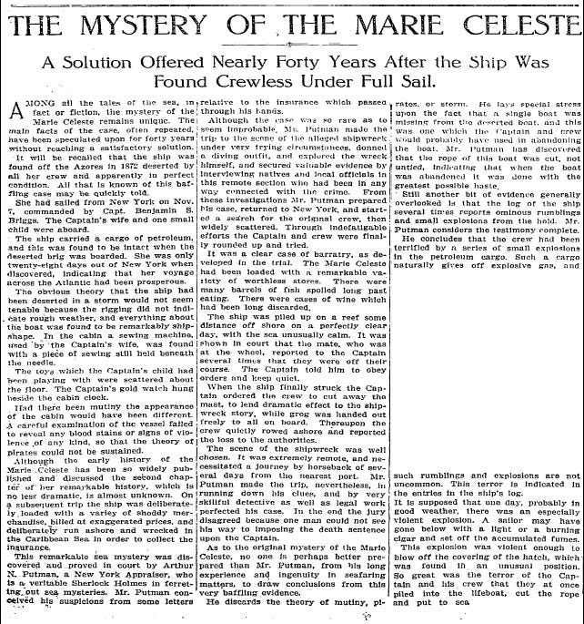 THE MYSTERY OF THE MARIE CELESTE: A Solution Offered Nearly Forty Years After the Ship Was Found Crewless Under Full Sail. (PDF)
