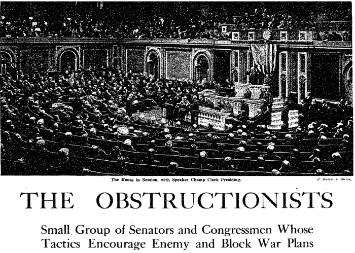 The comparisons aren't exact. The modern-day organization of several dozen hard-line conservatives in the House has helped kill or at least significantly delay or water down legislation supported by most congressional Republicans, such as Affordable Care Act repeal, tax reform, raising the debt ceiling, and more -- all on the basis that existing proposals weren't far enough to the right. The so-called "Obstructionists" wasn't so much an official caucus as an informal group of legislators who banded together in opposition to one particular issue above all else -- American involvement in World War I -- rather than on a variety of issues.