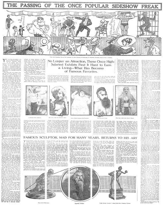 THE PASSING OF THE ONCE POPULAR SIDESHOW FREAK: No Longer an Attraction, These Once High-Salaried Exhibits Find It Hard to Earn a Living -- What Has Become of Famous Favorites. (PDF)