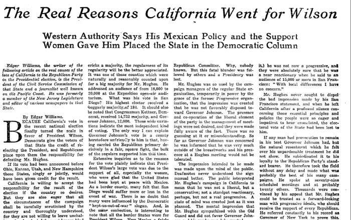 The Real Reasons California Went for Wilson: Western Authority Says His Mexican Policy and the Support Women Gave Him Placed the State in the Democratic Column