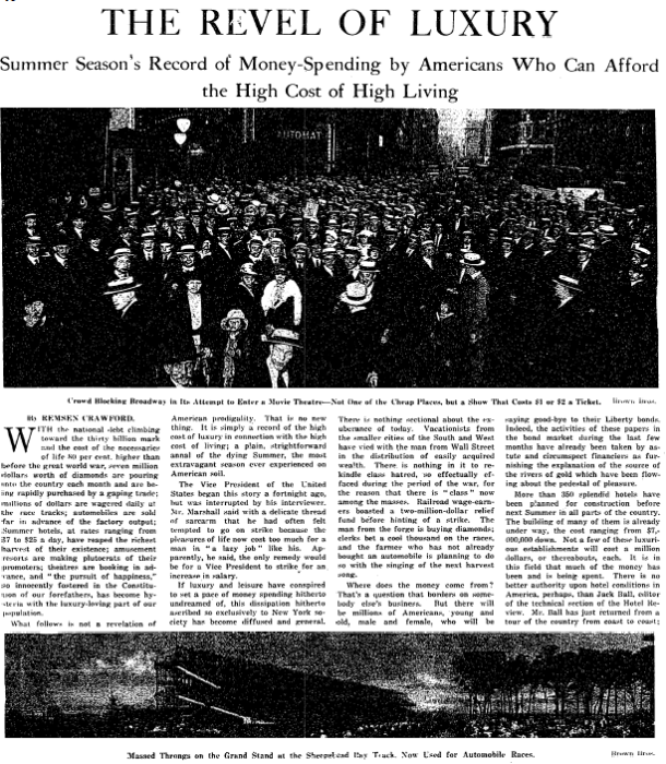 If luxury and leisure have conspired to set a pace of money spending hitherto undreamed of, this dissipation hitherto ascribed so exclusively to New York society has become diffused and general. There is nothing sectional about the exuberance of today. Vacationists from the smaller cities of the South and West have vied with the man from Wall Street in the distribution of easily acquired wealth. There is nothing in it to rekindle class hatred, so effectually effaced during the period of war, for the reason that there is "class" now among the masses. Railroad wage-earners boasted a two-million-dollar relief fund before hinting of a strike. The man from the forge is buying diamonds; clerks bet a cool thousand on the races, and the farmer who has not already bought an automobile is planning to do so with the singing of the next harvest song.