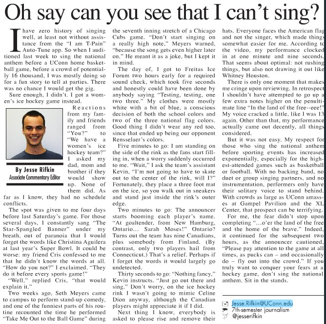 I can personally attest that being the singer for the national anthem before a sports game, as this column I wrote for my college newspaper years ago recounts: