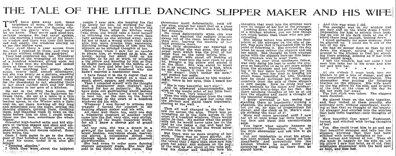 They have gone away now, those neighbors of mine, the little shoe-maker who made the dancing slippers and his pretty wife. They never let me know. They never said good-bye, perhaps because we had never spoken, but one morning I looked out of my kitchen window and there was their flat below sad and empty, the windows staring up at me like hollow eyes.