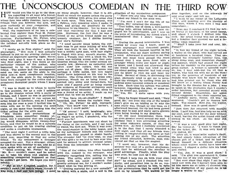 Well, the experience of no less a celebrated first nighter than [playwright] Paul M. Potter is the best answer to this hypothetical question. Furthermore, Mr. Potter, who admits the joke is on him, declares that the incident actually took place as described.