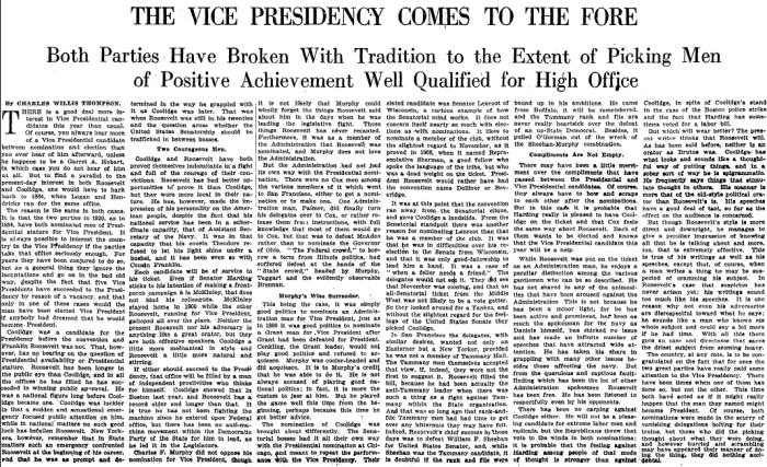 "The two parties in 1920... have both nominated men of Presidential stature for Vice President," a New York Times article that summer read. Those two men were FDR and Calvin Coolidge, who would both become president. In fact, 1920 is the only year in American history when both major-party vice presidential nominees later became president.