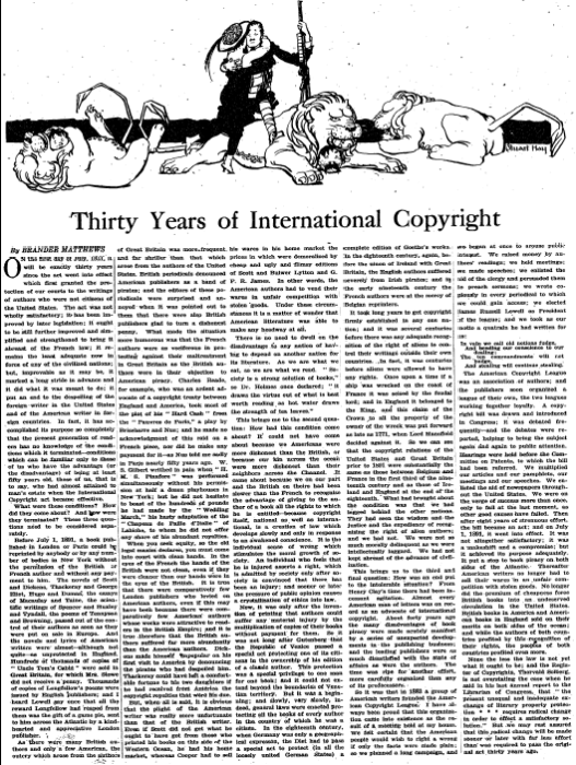 The Chace Act of 1891 gave copyright to non-U.S. works in return for international copyright protections for American authors. On the law's 30th anniversray, Brander Matthews wrote that he considered the law a smashing success.