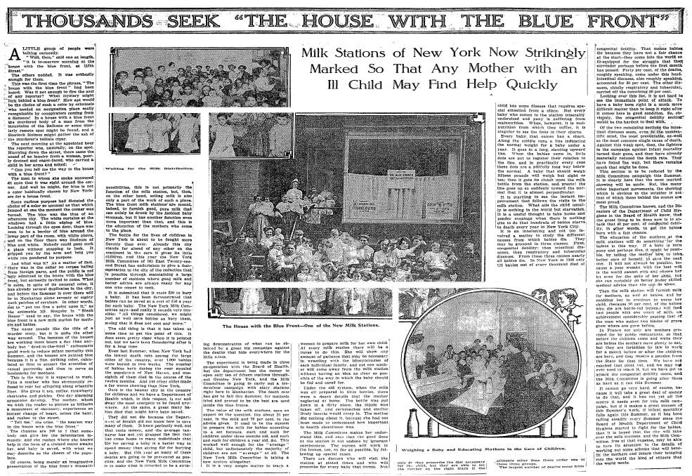 THOUSANDS SEEK "THE HOUSE WITH THE BLUE FRONT" Milk Stations of New York Now Strikingly Marked So That Any Mother with an Ill Child May Find Help Quickly (PDF)