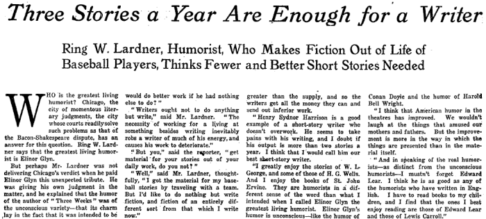 Three Stories a Year Are Enough for a Writer: Ring W. Lardner, Humorist, Who Makes Fiction Out of Life for Baseball Players, Thinks Fewer and Better Short Stories Needed