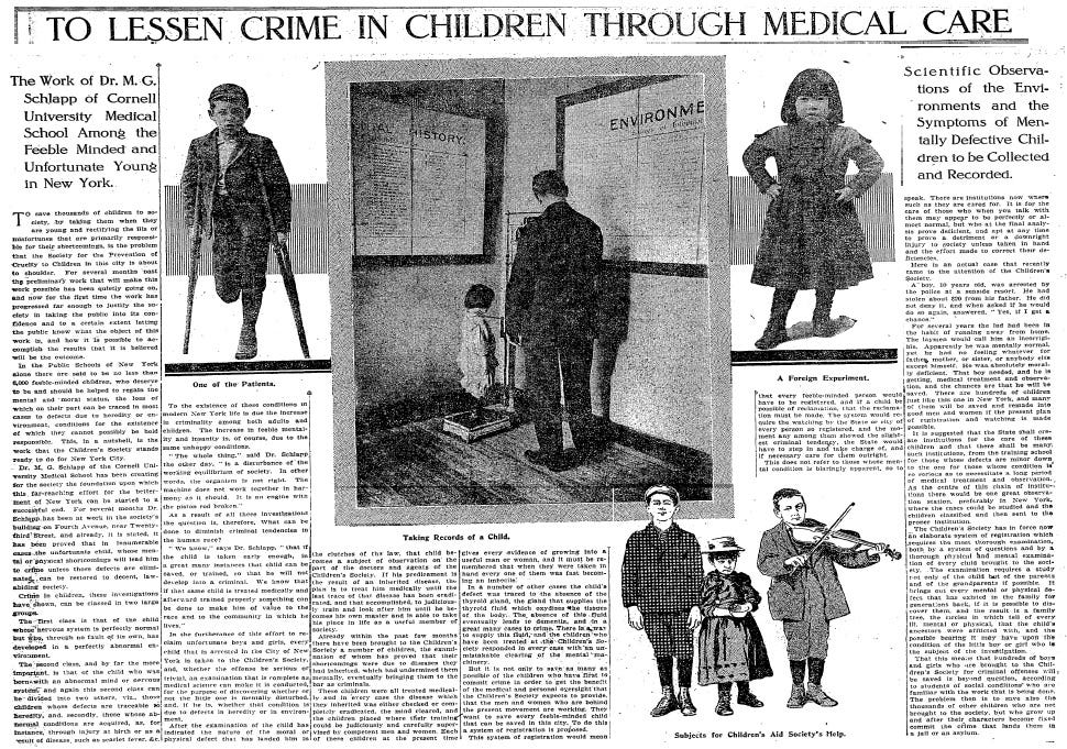 TO LESSEN CRIME IN CHILDREN THROUGH MEDICAL CARE: The Work of Dr. M. G. Schlapp of Cornell University Medical School Among the Feeble Minded and Unfortunate Young in New York; Scientific Observations of the Environments and the Symptoms of Mentally Defective Children to be Collected and Recorded. (PDF)