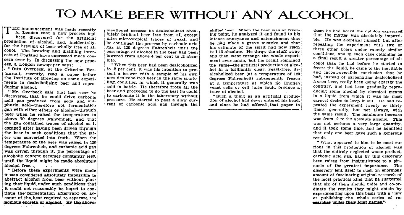 "Mr. Overback [of the Criterion Restaurant] said that last year he discovered that he could drive carbonic acid gas produced from soda and sulphuric acid -- therefore not fermentation gas with ethers or alcohol -- through beer when he raised the temperature to above 70 degrees Fahrenheit, and that the gas contained traces of alcohol as it escaped after having been driven through the beer in such conditions that the latter was converted into froth. When the temperature of the beer was raised to 120 degrees Fahrenheit, and carbonic acid gas was driven through it, the percentage of alcoholic content becomes constantly less until the liquid might be made absolutely alcohol free.