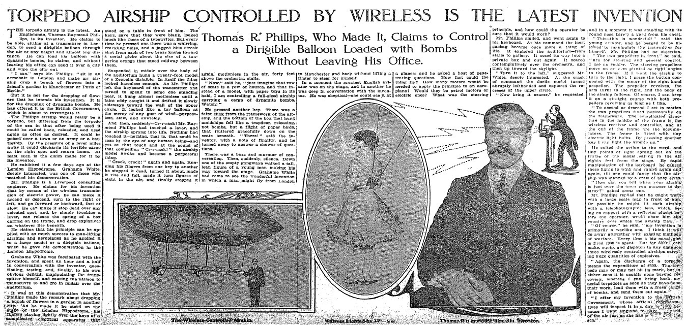 TORPEDO AIRSHIP CONTROLLED BY WIRELESS IS THE LATEST INVENTION: Thomas R. Phillips, Who Made It, Claims to Control a Dirigible Balloon Loaded with Bombs Without Leaving His Office. (PDF)